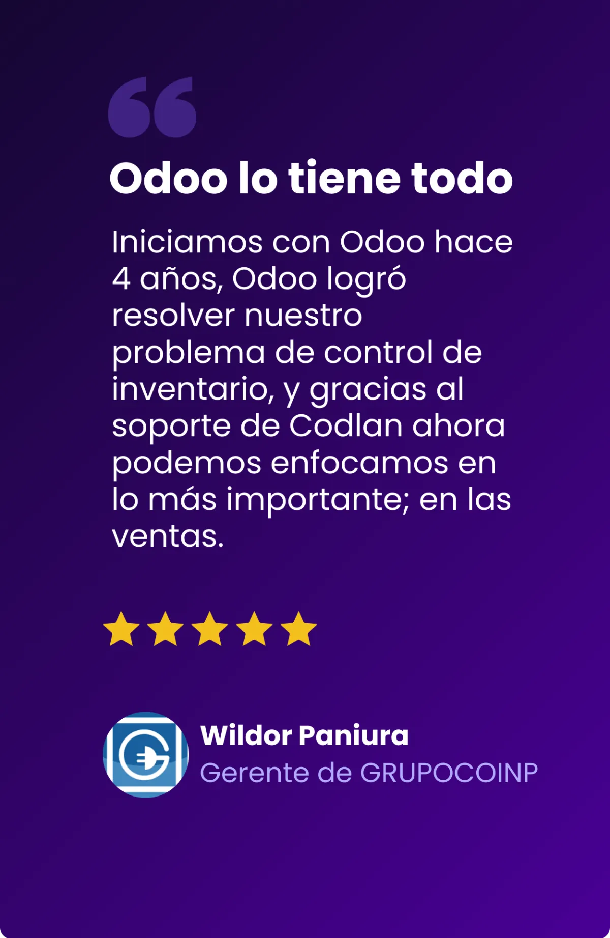 Hola Soy Daniel, CEO de Codlan, mi experiencia arranca en 2017 con el desarrollo de un sistema de Facturación Electrónica para Odoo v11, hoy es un pilar para un centenar de empresas en Perú que siguen contando con nuestro soporte y mejoras continuas. Y me alegra contar que ya mi equipo y yo lanzamos este año la facturación electrónica en la última versión de Odoo(V17).